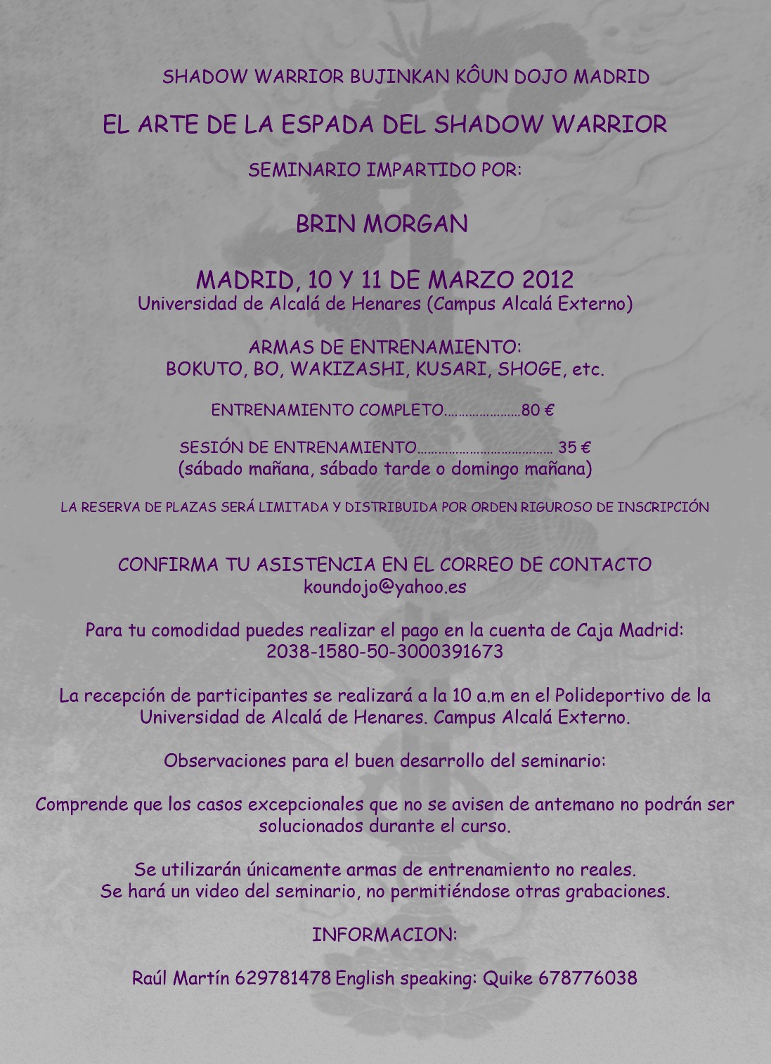 Y finalmente, el seminario de Brin Morgan en Alcalá de Henares (Madrid) los días 10 y 11 de marzo.