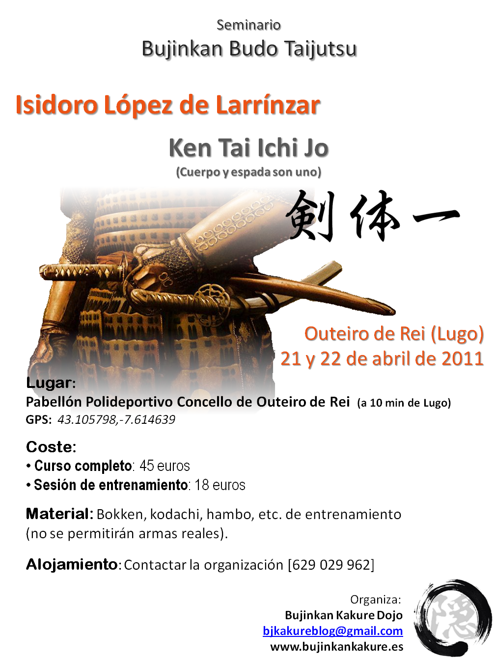 Una vez más, tenemos el placer de informaros que hemos organizado un seminario de Isidoro López de Larrínzar. Éste tendrá lugar los días 21 y 22 de abril en el pabellón polideportivo de Outeiro de Rei (Lugo), nuestro lugar de entrenamiento habitual. En breve os ofreceremos más información, entretanto dejamos aquí el cartel informativo.